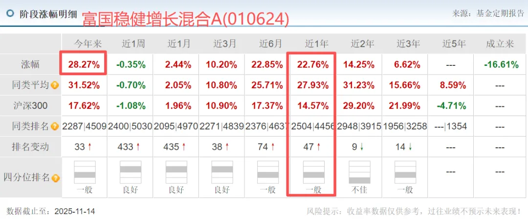 富国稳健增长混合A,上任时间2024年10月10日,截至2025年9月30日,基金公司持有该基金金额达到了1619万元;截至2025年11月14日,该基金今年上涨28.27%,近1年涨幅22.76%。