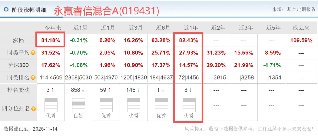 永赢睿信混合A,上任时间2023年12月22日,截至2025年9月30日,基金公司持有该基金金额达到了2049万元;截至2025年11月14日,该基金今年上涨81.18%,近1年涨幅82.43%,大象起舞了。
