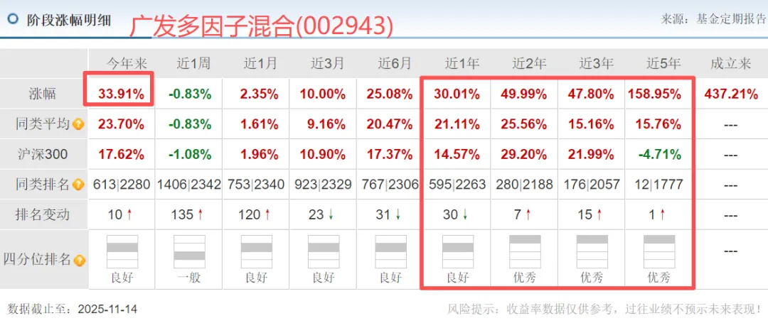 广发多因子混合,上任时间2018年6月25日,截至2025年9月30日,基金公司持有该基金金额达到了4177万元;截至2025年11月14日,该基金今年上涨33.91%,近2年涨幅49.99%,近3年涨幅47.80%,近5年涨幅158.95%,近2年、近3年、近5年的四分位排名均是优秀。