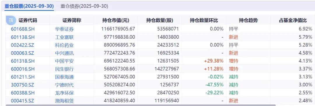 2025Q3重仓股展示如下,唐晓斌、杨冬三季度增持的有中国平安、民生银行,新面孔有工业富联、中兴通讯、渤海租赁。