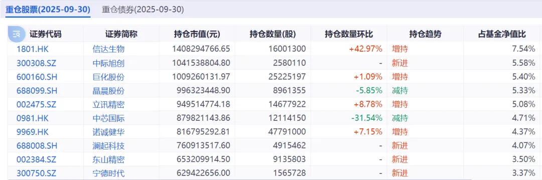 2025Q3重仓股展示如下,谢治宇三季度增持的有信达生物、巨化股份、立讯精密、诺诚健华,新面孔有中际旭创、澜起科技、东山精密、宁德时代。