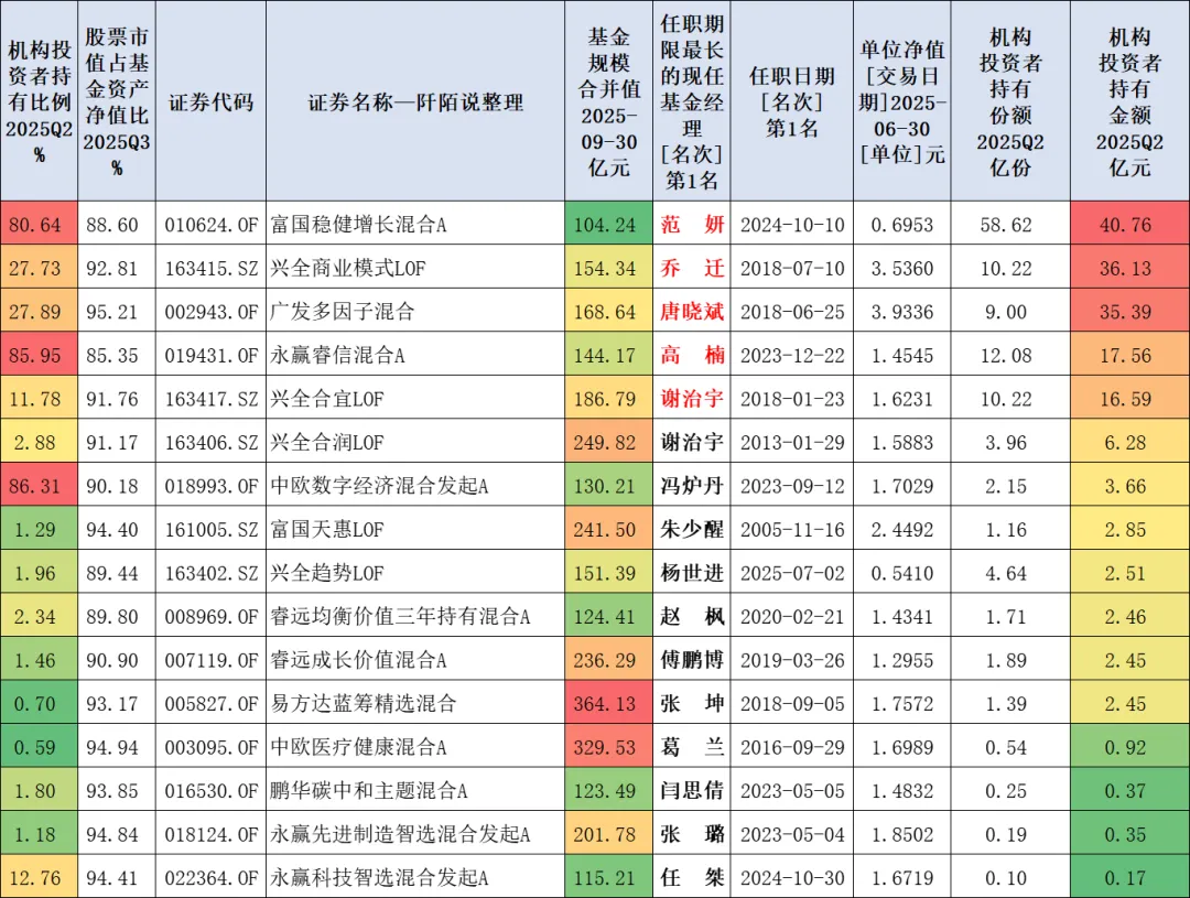 截至2025年6月30日,机构持有富国稳健增长混合A达到了40.76亿元;持有乔迁的兴全商业模式LOF达到了36.13亿元,持有唐晓斌的广发多因子混合达到了35.39亿元。
