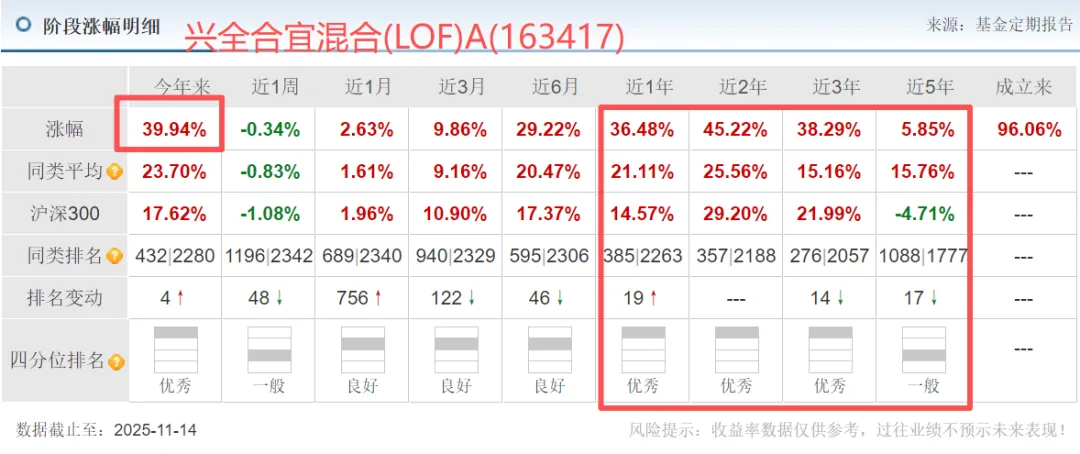 兴全合宜LOF,上任时间2018年1月23日,截至2025年9月30日,基金公司持有该基金金额达到了1.80亿元;截至2025年11月14日,该基金今年上涨39.94%,近1年涨幅36.48%,近2年涨幅45.22%,近3年涨幅38.29%。近一年谢治宇发力了。