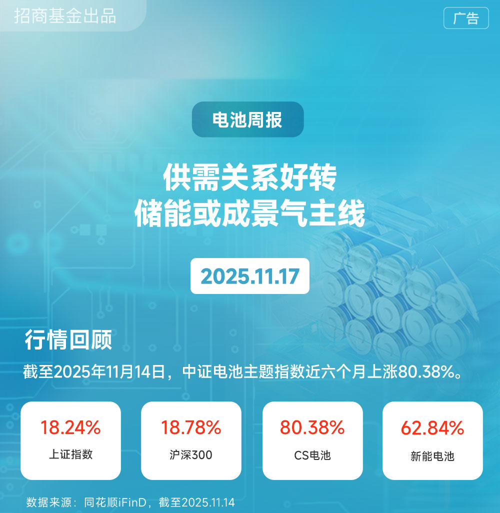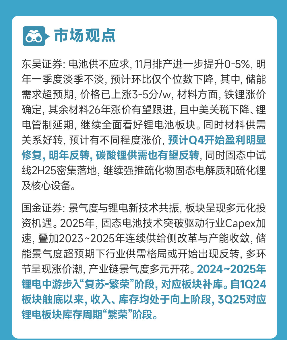 东吴证券:电池供不应求,11月排产进一步提升0-5%,明年一季度淡季不淡,预计环比仅个位数下降,其中,储能需求超预期,价格已上涨3-5分/w,材料方面,铁锂涨价确定,其余材料26年涨价有望跟进,且中美关税下降、锂电管制延期,继续全面看好锂电池板块。同时材料供需关系好转,预计有不同程度涨价,预计Q4开始盈利明显修复,明年反转,碳酸锂供需也有望反转,同时固态中试线2H25密集落地,继续强推硫化物固态电解质和硫化锂及核心设备。