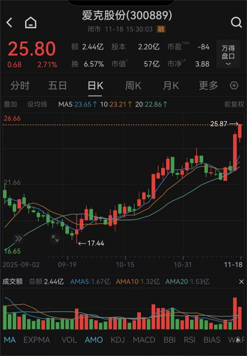 截至11月18日收盘,爱克股份每股报25.8元,上涨2.71%,公司最新市值为57亿元。