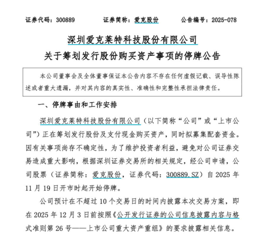 爱克股份表示,预计在不超过10个交易日的时间内披露本次交易方案,即在12月3日前按照《公开发行证券的公司信息披露内容与格式准则第26号——上市公司重大资产重组》的要求披露相关信息。