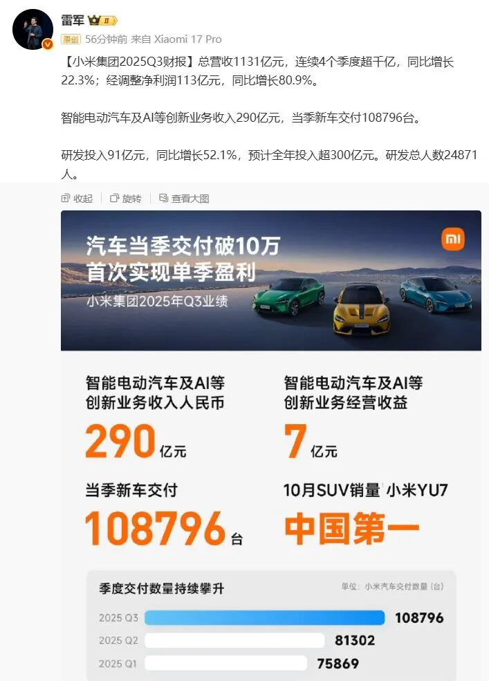 11月18日,小米集团(1810.HK)发布2025年第三季度财报,多项核心数据表现较好。当季集团总收入达1131亿元,同比增长22.3%,连续4个季度突破千亿;经调整净利润113亿元,同比大增80.9%,创历史新高。