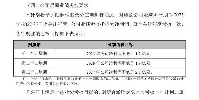 具体考核目标为:2025年公司净利润不低于1.2亿元;2026年公司净利润不低于1.8亿元;2027年公司净利润不低于2.7亿元。