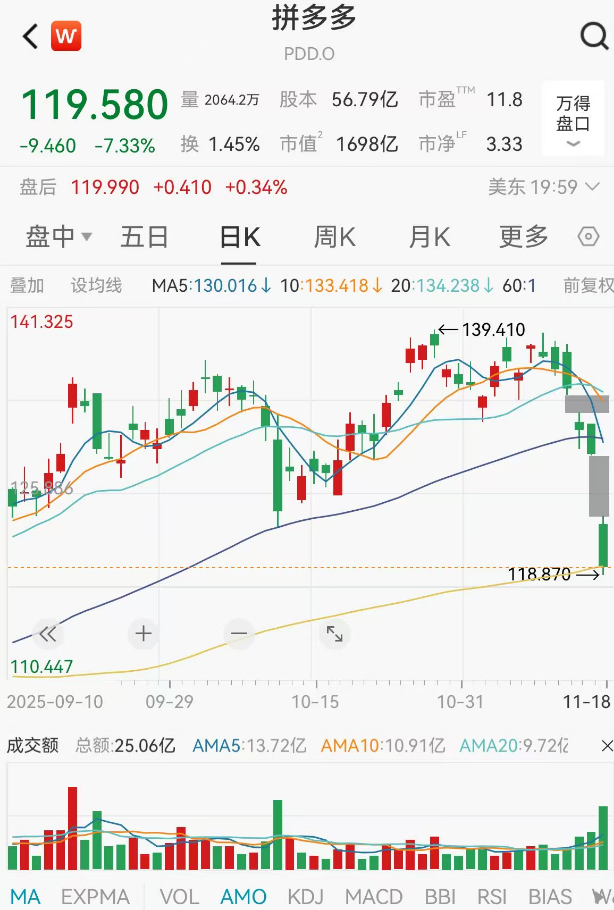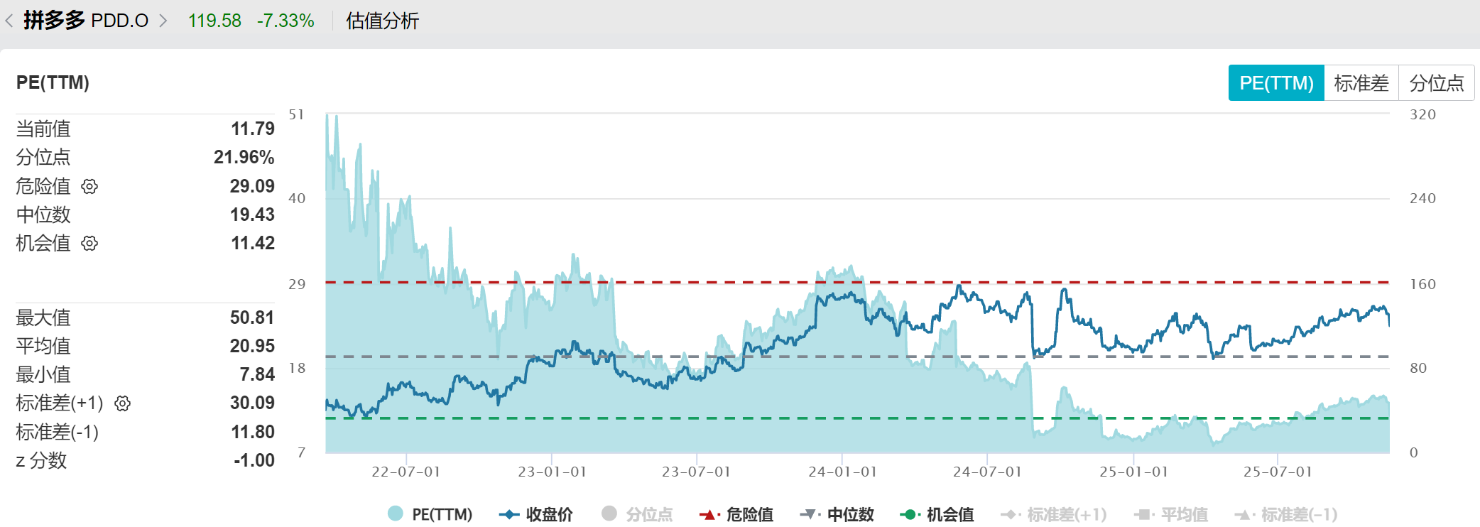 截止到11月19日,拼多多总市值约1700亿美元,按照TTM业绩,拼多多2024Q4~2025Q3过去四个季度的累计净利润约140亿美元。