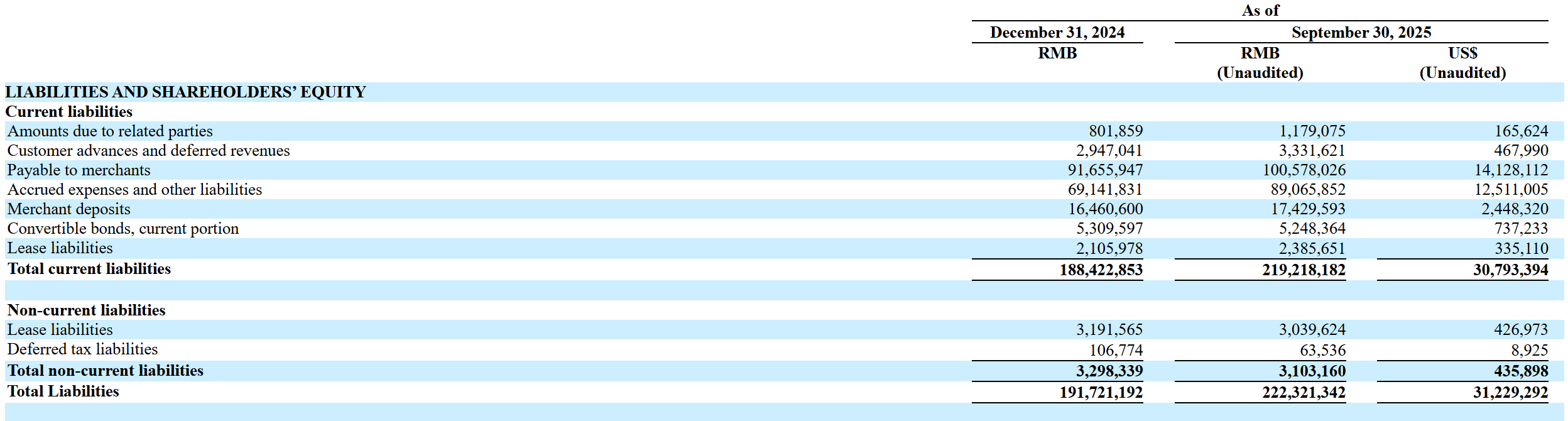 再来看拼多多的负债情况。截止到2025Q3,拼多多合计负债312亿美元,其中有息负债只有大约7亿美元(可转债),无息负债中,应付商户账款约141亿美元、应计费用及其他负债约125亿美元,另有约24亿美元的商户存款。
