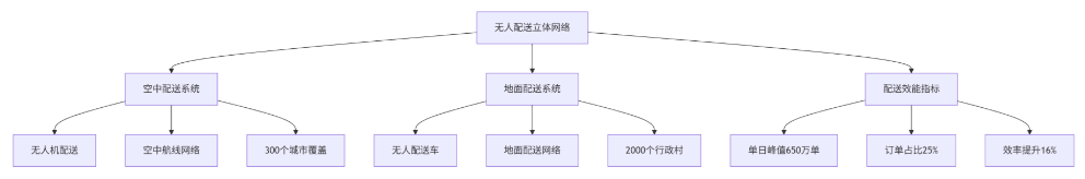2025年双11成为无人配送技术爆发的关键节点,无人机、无人配送车形成"空中+地面"的立体配送网络,覆盖全国300个城市及2000多个偏远行政村,完成的末端配送订单占比达25%,较2024年提升16个百分点,单日最高配送量突破650万单,有效缓解了末端配送压力。