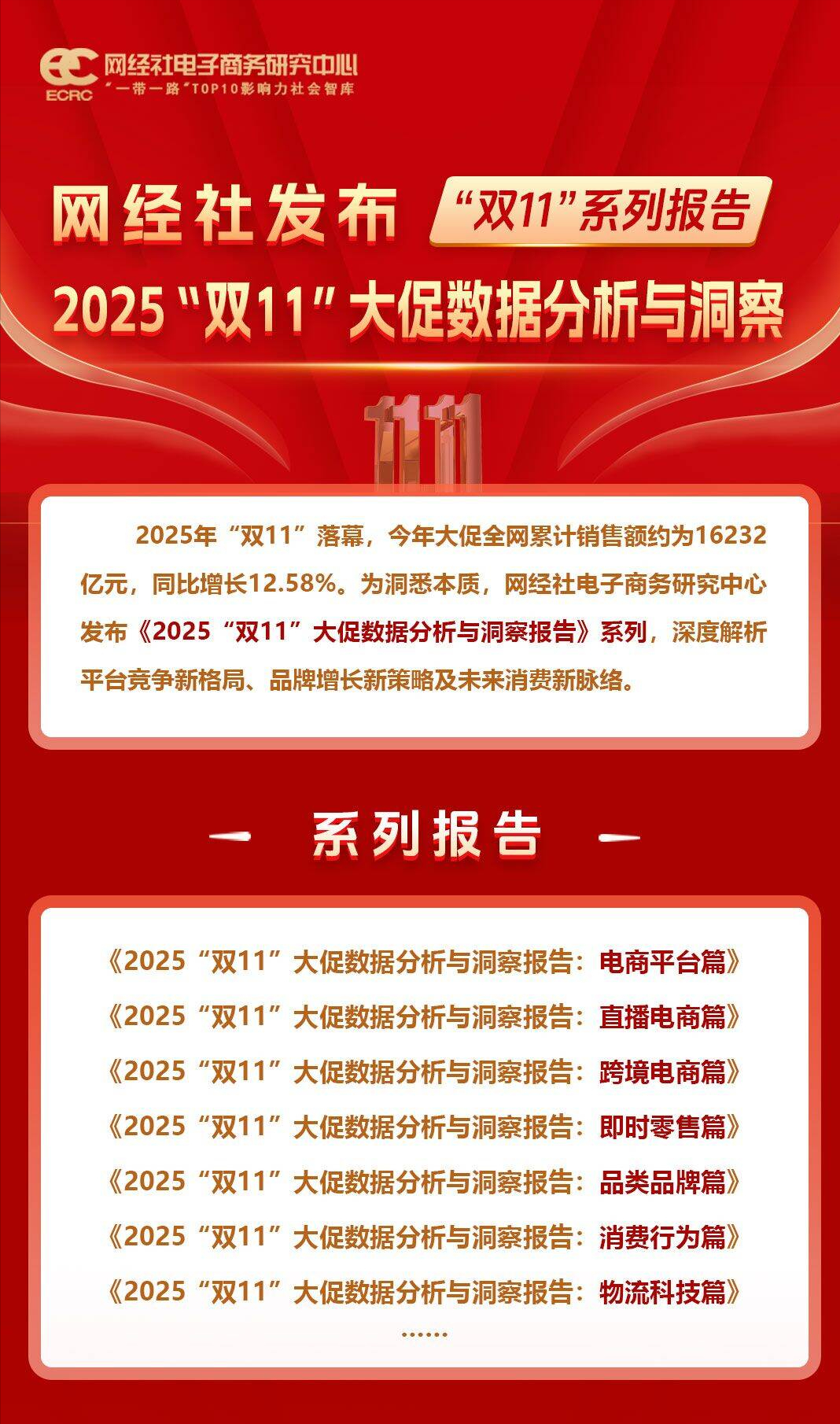网经社电子商务研究中心据此发布《2025“双11”大促数据分析与洞察报告:物流科技篇》,以及《2025“双11”大促数据分析与洞察报告:直播电商篇》《2025“双11”大促数据分析与洞察报告:电商平台篇》《2025“双11”大促数据分析与洞察报告:消费行为篇》《2025“双11”大促数据分析与洞察报告:品类品牌篇》《2025“双11”大促数据分析与洞察报告:跨境电商篇》《2025“双11”大促数据分析与洞察报告:即时零售篇》系统梳理本届大促的发展现状、生态体系与未来趋势。