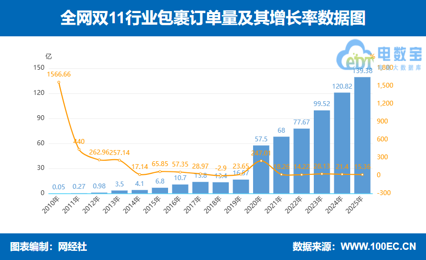 据网经社电商大数据库“电数宝”显示,2025年双11购物节期间(10月21日至11月11日),全国邮政快递企业累计揽收快递包裹量达到139.38亿件。在此期间,行业日均处理包裹6.34亿件,约为日常业务量的1.18倍;单日最高业务量突破7.77亿件,刷新了行业单日处理纪录。
