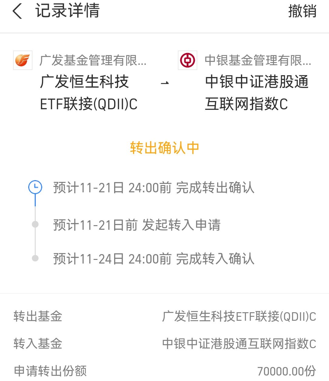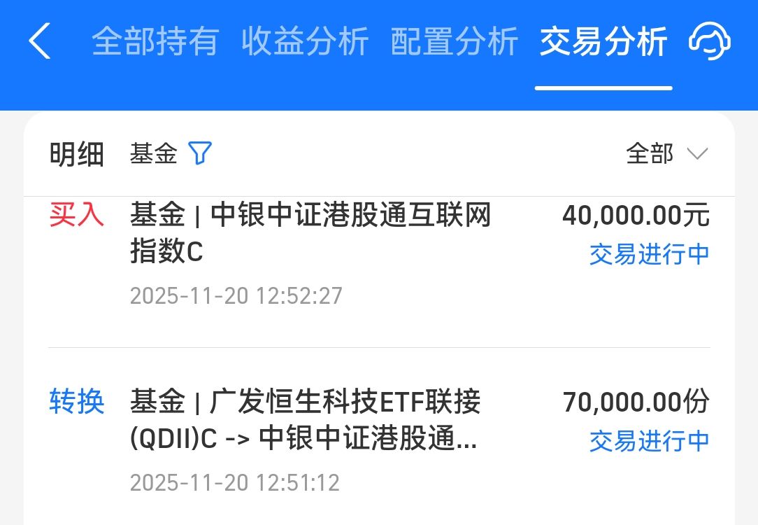 决定了!今天正式出手加仓,一口气大幅买入10万元的$$中银中证港股通互联网指数发起C(OTCFUND|025187)$$,该基金布局港股科技互联网大厂,其中前三大持仓个股为阿里、腾讯和小米,持仓均超10%以上,持仓阿里更是超过了16%以上,而这几个大厂都是近期业绩好到爆棚的公司,且深度布局AI人工智能应用端,未来成长性不可限量。由于受到近期大盘的持续震荡,整个互联网板块都迎来了较深的回调,这与他们的业绩面、基本面明显背离了,因此存在着极大的反弹需求,因此在港股 科技指数五连跌之际,我正式决定出手,且一出手就是大动作抄底。其中通过转换买入6万元左右,现金买入4万元整,共计10万元左右。