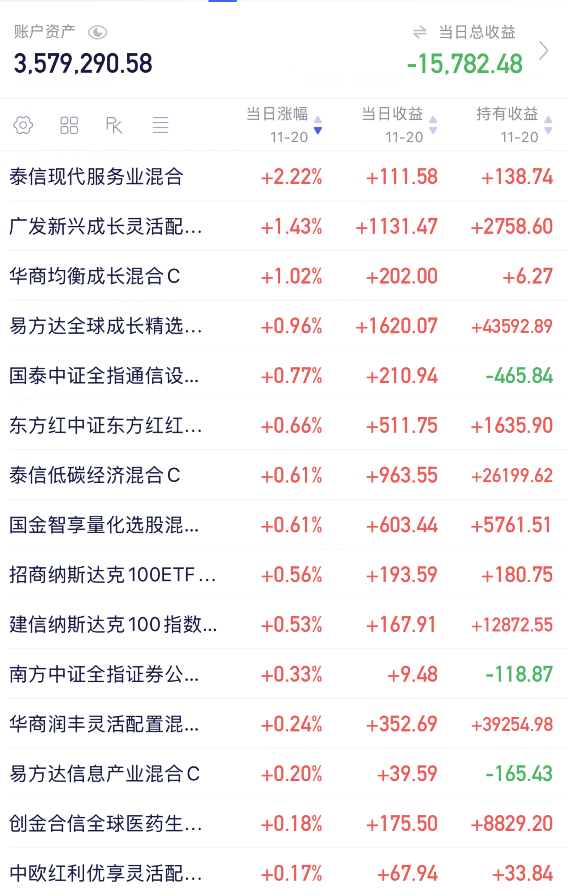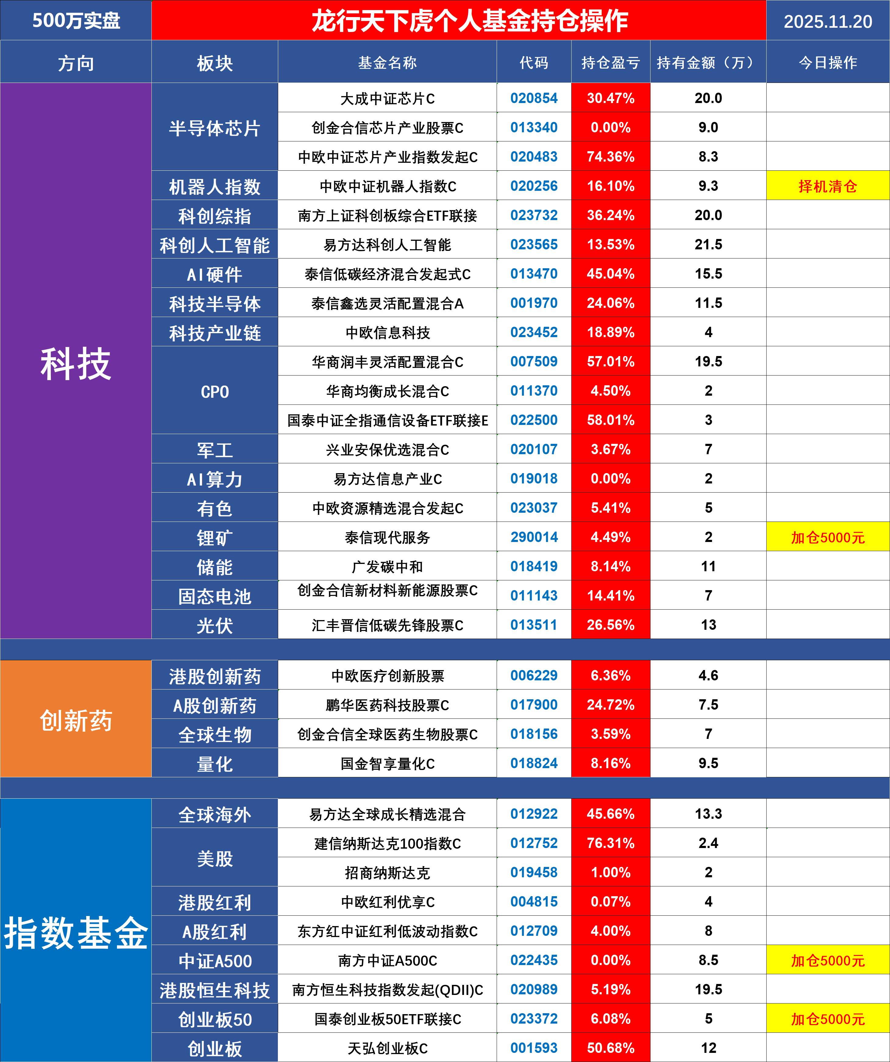 由于最近很多次A股都是黑周五,所以大龙稳一手暂时不做什么大动作,先等A股回暖点我在干,安全第一,大龙还是那句话,年底A股没什么大行情,暂时还是多看少动的好, 老龙今天加仓南方中证A500、广发新兴、创金合信资源、国泰创业板50、泰信现代、今日总计加仓2.5万, 减仓0万 。