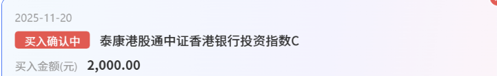 泰康港股通中证香港银行投资指数C+2000。今早英伟达业绩超预期以为能带动科技反攻结果还是银行和红利护盘,可见现在避险情绪还是很浓厚啊,我继续稳一手,买一点银行指数。泰康香港银行指数投资港股银行板块,这个板块指数的特点是成分股具有较高的分红率,在低利率环境下配置的价值是凸显的,可以看到港股银行指数从低点反弹了不少,并且今天也是前排上涨,最近一个月涨幅更是高达6.15%,当下科技股波动太大,还是需要避险一下的。从长期看泰康港股通银行指数,近半年上涨14.31%,近一年上涨38.94%,如果可以忽略中间的波动,长期收益也是非常亮眼的,大鹅今天开始建仓,先建仓一笔,后续根据行情再买入。