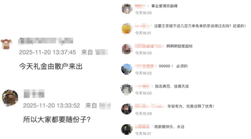在请柬铺天盖地的传播下,11月20日,天合光能和霸王茶姬却没有因为这则喜讯上涨,反而双双下跌,霸王茶姬收盘下跌2.6%,天合光能下跌5.06%。有网友戏称“今天的礼金由散户来出”,但更多网友都对二人的喜结连理献上祝福。