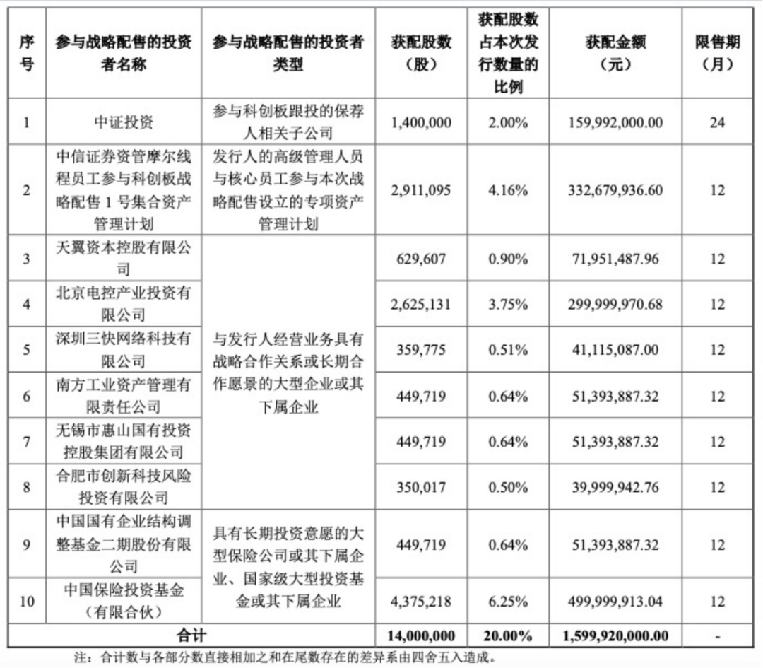 参与战略配售的投资者获配此次发行数量的20%,名单包括中证投资、中信资管摩尔线程员工资管计划、天翼资本控股有限公司(下称“天翼资本”)、深圳三快网络科技有限公司等与摩尔线程经营业务具有战略合作关系或长期合作愿景的大型企业或其下属企业,以及具有长期投资意愿的大型保险公司或其下属企业、国家级大型投资基金或其下属企业等。