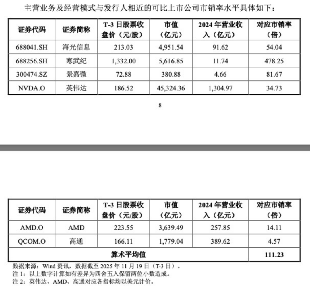 横向对比来看,主营业务及经营模式与摩尔线程相近的六家可比上市公司,2025年11月19日市销率算术平均值为111.23倍。其中,寒武纪市销率为478.25倍,位居首位;高通(QCOM.O)为4.57倍,位居末尾;英伟达(NVDA.O)为34.73倍。