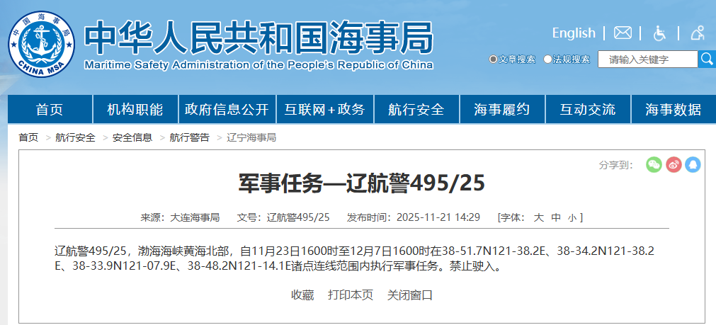 辽航警495/25,渤海海峡黄海北部,自11月23日16:00时至12月7日16:00时在38-51.7N121-38.2E、38-34.2N121-38.2E、38-33.9N121-07.9E、38-48.2N121-14.1E诸点连线范围内执行军事任务。禁止驶入。