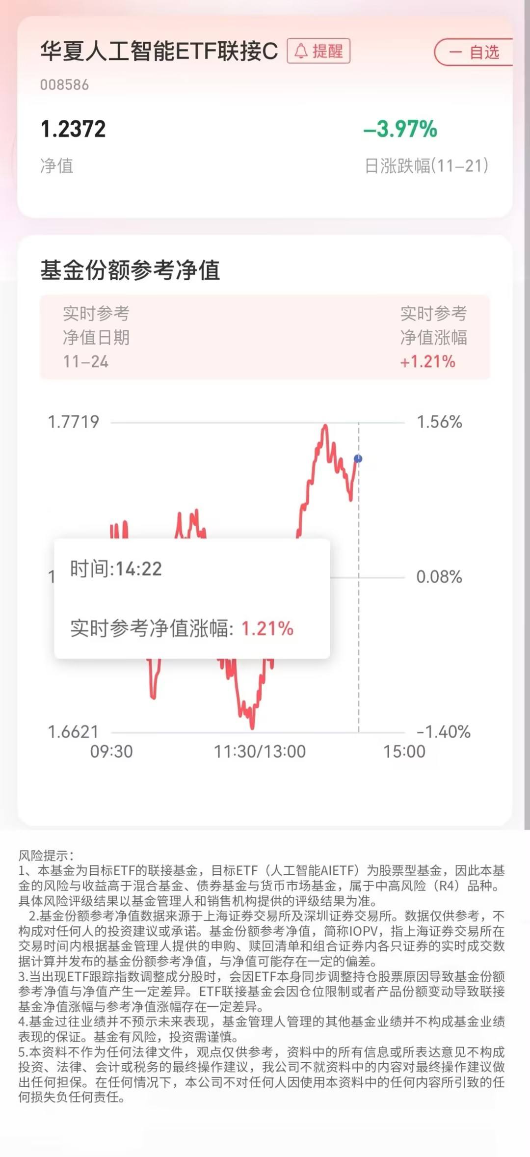 截止至2025年11月24日14:22,本基金跟踪目标基金的实时参考净值涨幅为1.21%。