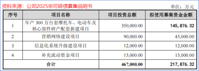 11月19日,春风动力向不特定对象发行可转换公司债券成功过会,本次可转债预计募资不超过21.79亿元,主要用于年产300万台套摩托车、电动车及核心部件研产配套新建项目、营销网络建设项目等,总投资额46.7亿元。