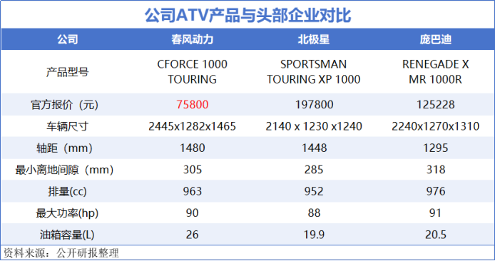 面对行业头部企业北极星、庞巴迪的竞争,春风动力采取了高性价比的竞争策略。其ATV车型在参数上与国际巨头不相上下,但价格仅为75800元,具有明显的优势。