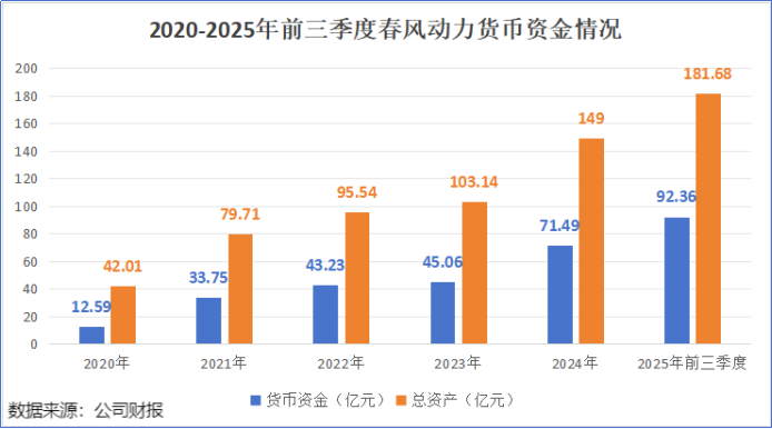 截至2025年三季度末,春风动力的总资产为181.68亿元,其中货币资金就占了92.36亿元,占比高达50.84%。
