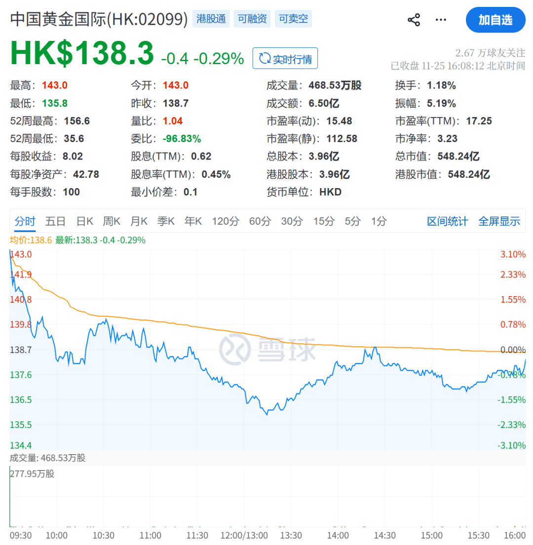 截至11月25日收盘,中金黄金国际港股股价为138.3港元/股,总市值为548.24亿港元。