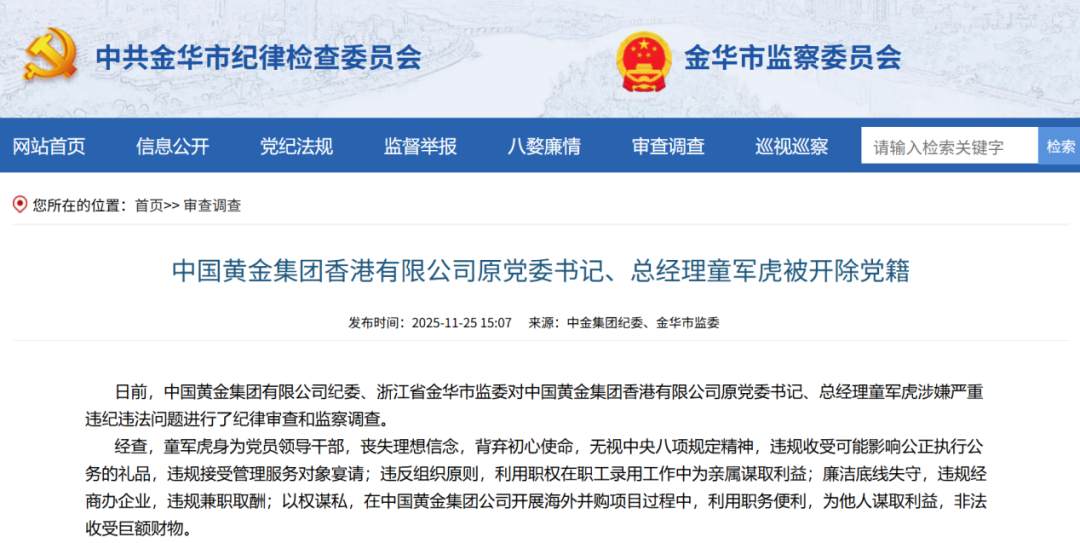 11月25日,金华市纪委监委官网通报:中国黄金集团香港有限公司原党委书记、总经理童军虎被开除党籍。