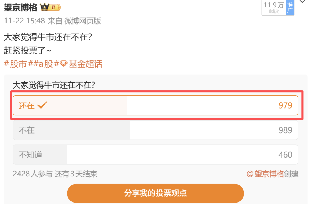 前几天博格搞了一个投票:“大家觉得牛市还在不在?”
