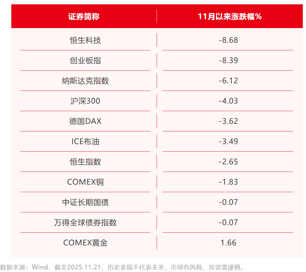 近期,全球大类资产出现调整,股票、商品等高风险资产首当其冲。纳斯达克指数11月以来跌幅已超6%,恒生科技、创业板指跌超8%。同时,万得全球债券指数、中证长期国债指数11月以来均下跌0.07%。11月以来ICE布油跌超3%,COMEX铜跌超1%。COMEX黄金尽管11月以来上涨1.66%,但较10月份高点以来跌超6%。