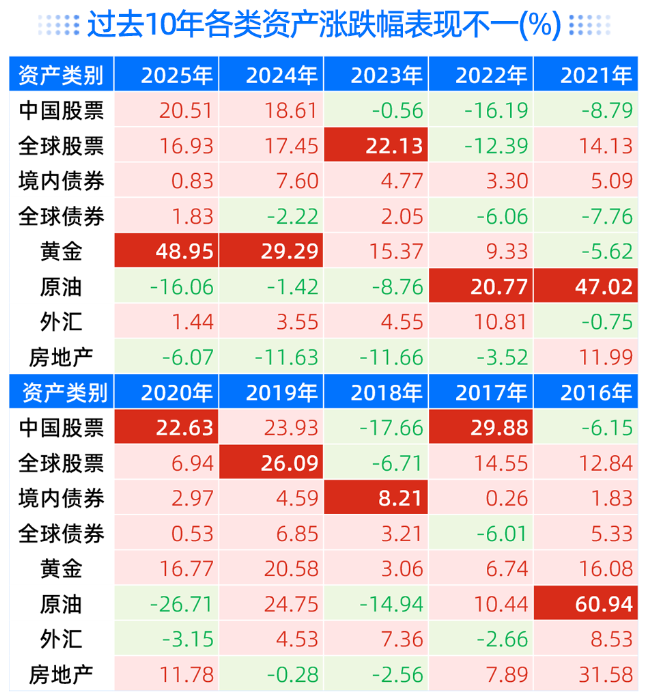 资料来源:Wind全球资产观察,截至2025.10.31。指数过往表现不代表未来,市场有风险,投资需谨慎。中国股票对应指数为万得中国500指数,全球股票为MSCI全球指数,境内债券为中债新综合财富(总值)指数,全球债券为万得全球债券指数,黄金为COMEX黄金,原油为ICE布伦特原油,外汇为万得外汇投资指数,房地产为万得一线城市房地产投资指数。
