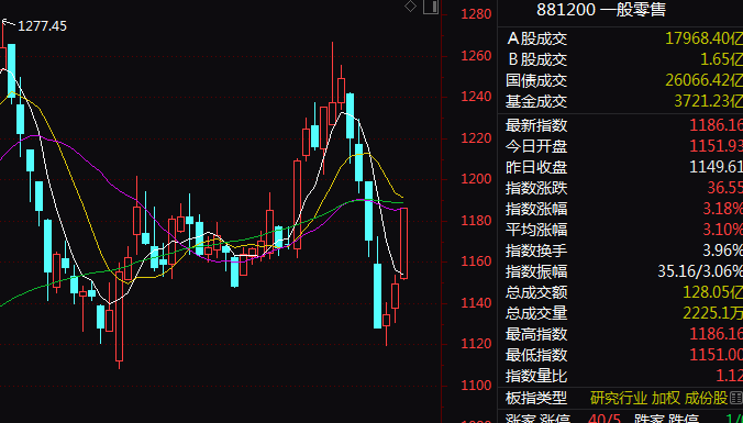市场热点方面,大消费全面走强,零售行业尾盘出现异动拉升走强,一般零售板块指数临近收盘最后半小时放量大涨逾3%,三江购物、东百集团、国光连锁等均在快收盘前直线涨停。