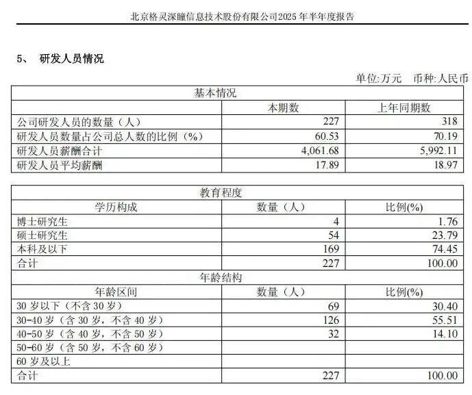 截至2025年上半年,格灵深瞳研发人员达227人,占比达60.53%。而上年同期,公司研发人员达318人,占比达70.19%。