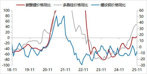 “反内卷”对价格影响的行业分化。10月PPI同比降幅连续三个月收窄。“反内卷”效果已经减弱,表现为螺纹钢、铁矿石等黑色系价格再度回到低位,10月黑色加工业PPI同比-4.5%(前值-0.6%)。然而“反内卷”对“新三样”价格的提振仍在持续显现。统计局指出,10月光伏设备及元器件制造、电池制造、汽车制造业价格降幅均收窄。