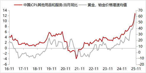 10月核心通胀同比连续六个月回升,续创24年3月以来新高。服务分项同比亦高于前值,年内仅次于春节所在的1月。本月核心通胀改善的原因主要在于假期刺激,今年国庆中秋假期合二为一,节假日天数多于去年同期。10月旅游分项同比2.1%(前值0.9%),年内仅次于1月,环比近十年来仅次于20年同期。另外,10月金饰品和铂金饰品价格同比继续高歌猛进,涵盖二者的“其他用品和服务”分项同比12.8%(前值9.9%),续创有数据记录以来新高。
