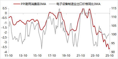 本月PPI降幅收窄的其他原因。除了“反内卷”在“新三样”行业价格上的持续显效,10月PPI同比降幅收窄的其他原因包括:第一,基数偏低。去年同期环比为负,且为近十年最低。第二,近几个月耐用品出口价格有所改善,而其与耐用品出厂价格走势较为一致。本月耐用消费品PPI同比-3.2%(前值-3.9%),创7月以来新高。展望后续,11-12月PPI基数偏高,且出口大概率位于年内低位,预计PPI小幅回落。