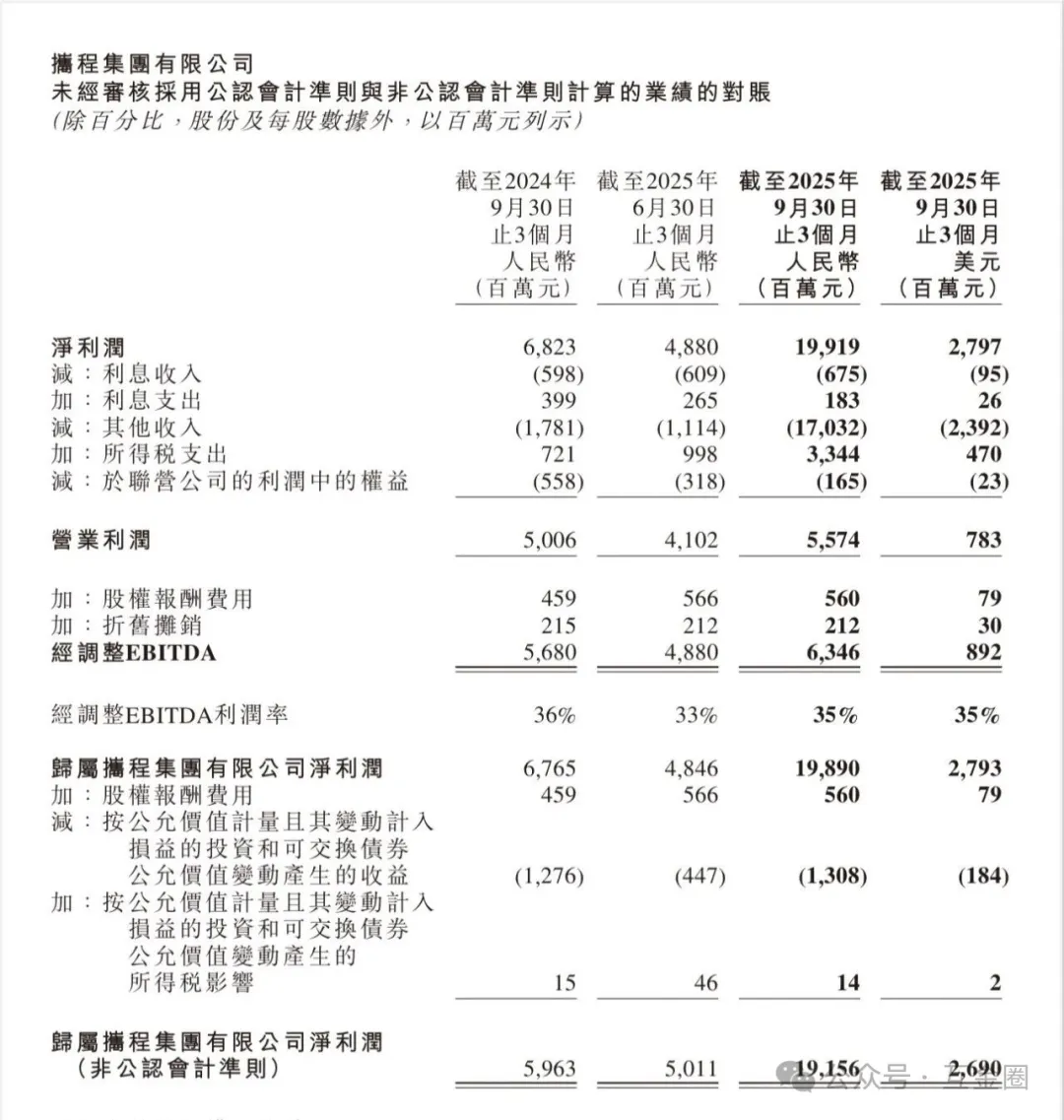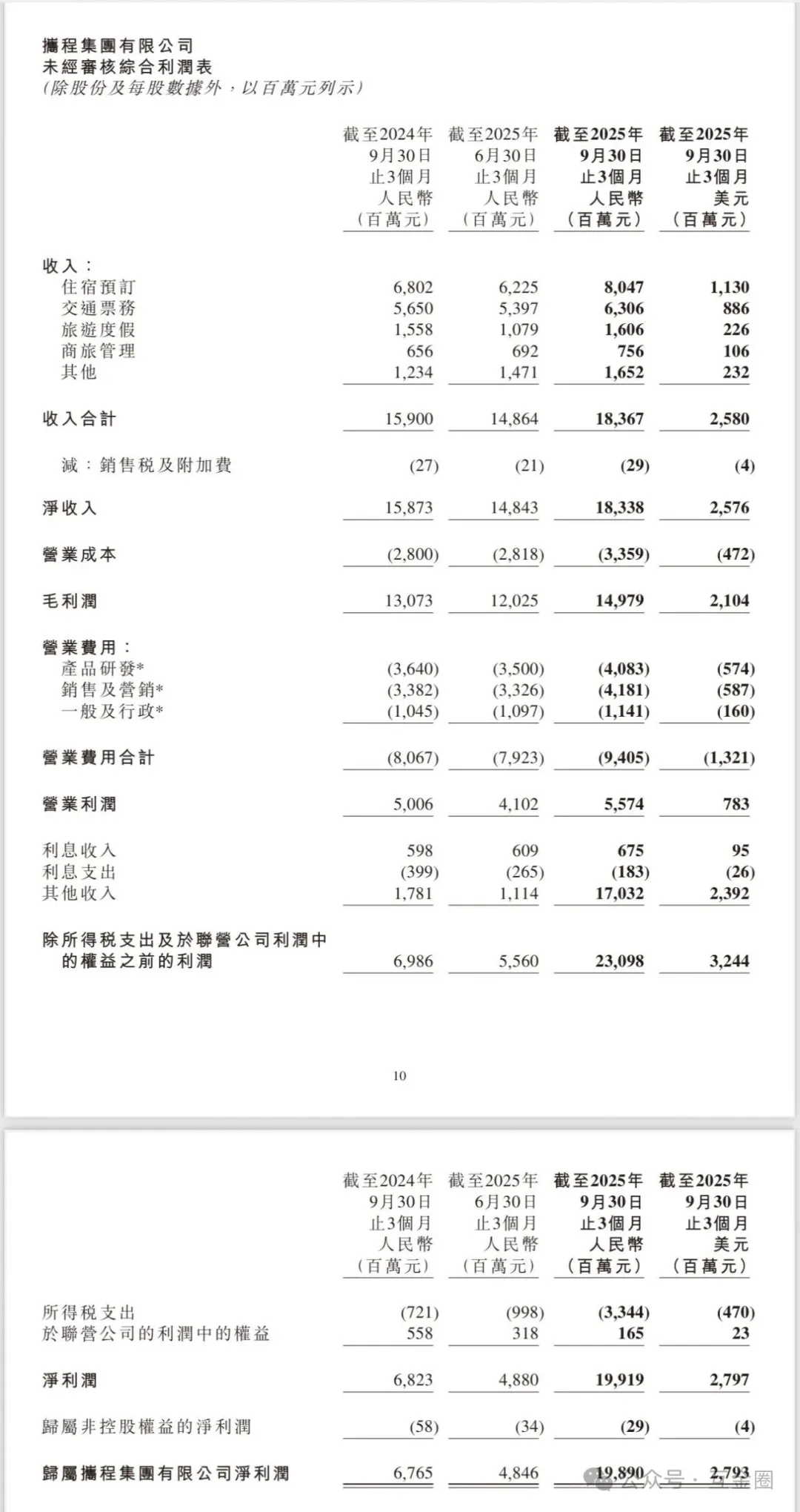 近日,携程集团(携程,Nasdaq:TCOM;携程集团-S,09961.HK)披露2025年第三季度未经审计的财务业绩。