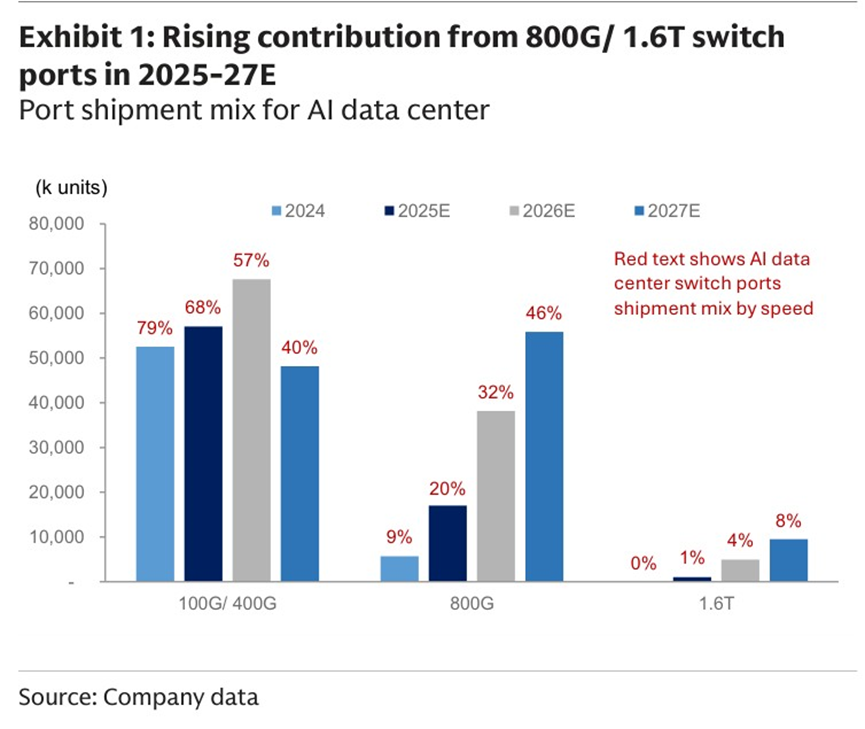 当前,800G需求放量,1.6T加速导入,行业处在800G向1.6T技术迭代时期。近期消息,Meta正考虑斥资十亿美元向谷歌采购新一代AI芯片TPU用于自家数据中心建设。