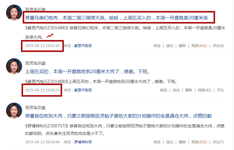 刚睡醒,这个周末无需复盘。周五百灵今作了两只票一支没有超预期,一支符合预期。下周静等吃肉。今日收盘后无意之中从涨幅榜里看到我的老大哥 豪恩汽电 再次大涨,给大家回顾一下百灵9月份当时此票的操作。