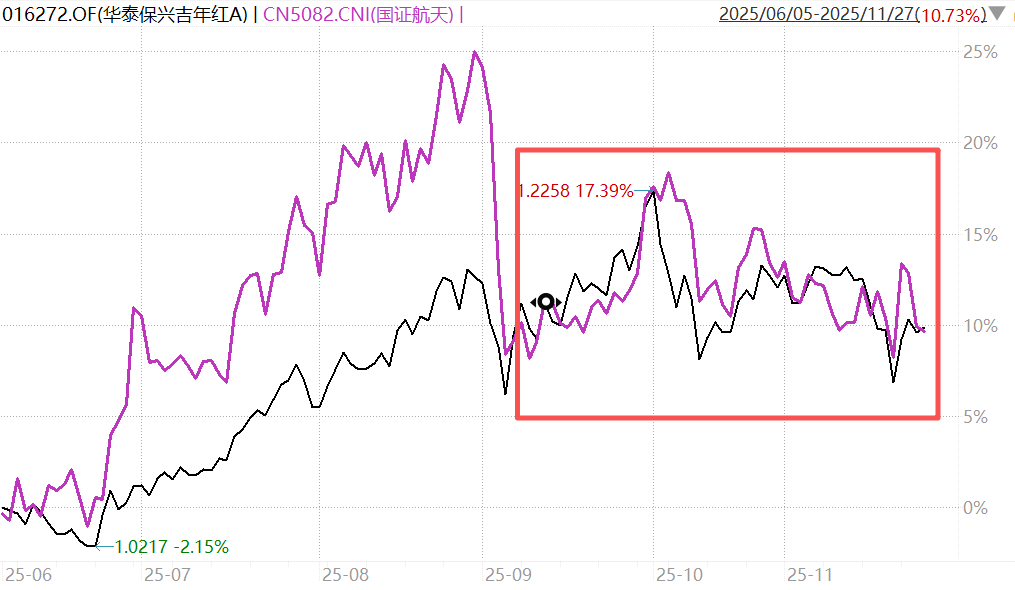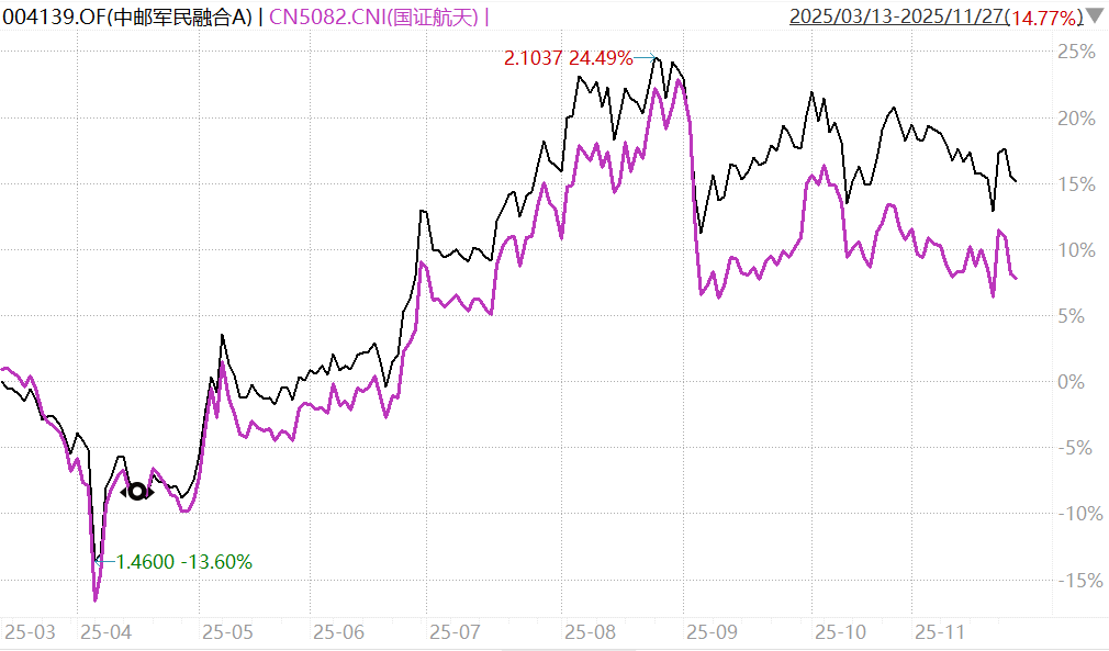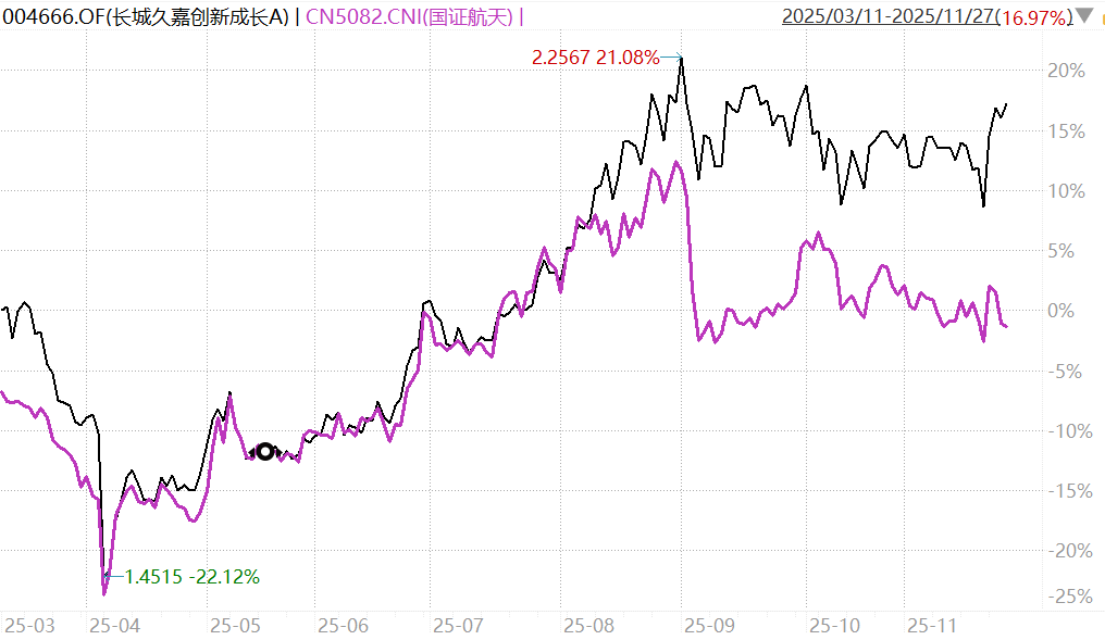 但看净值走势,9月以来的表现和国证航天指数其实也没差太多,之前则是跑输较多。