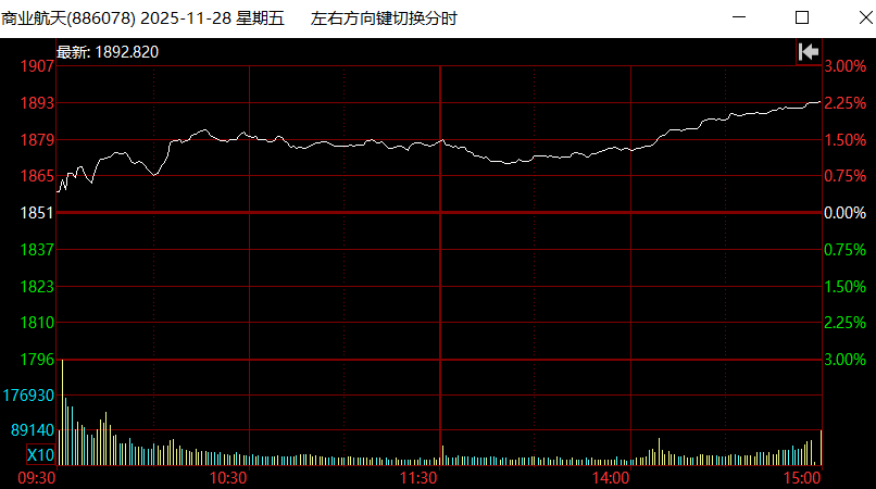 对标Space X 的星舰,中国的可回收火箭“朱雀三号”可能明天中午首飞。商业航天指数上午就开始走强,下午还拉了一波,概念股航天发展在2点10分左右快速拉涨停。