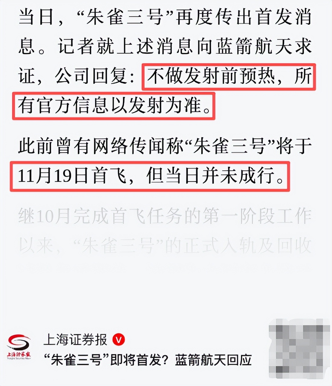 之前还传过11月19日首飞,但当天并没有飞。之后传言变成11月下旬。还有媒体就此事向蓝箭航天求证,得到的答复是:不做发射前预热,所有官方信息以发射为准。