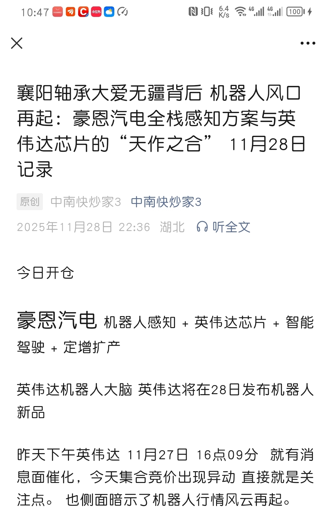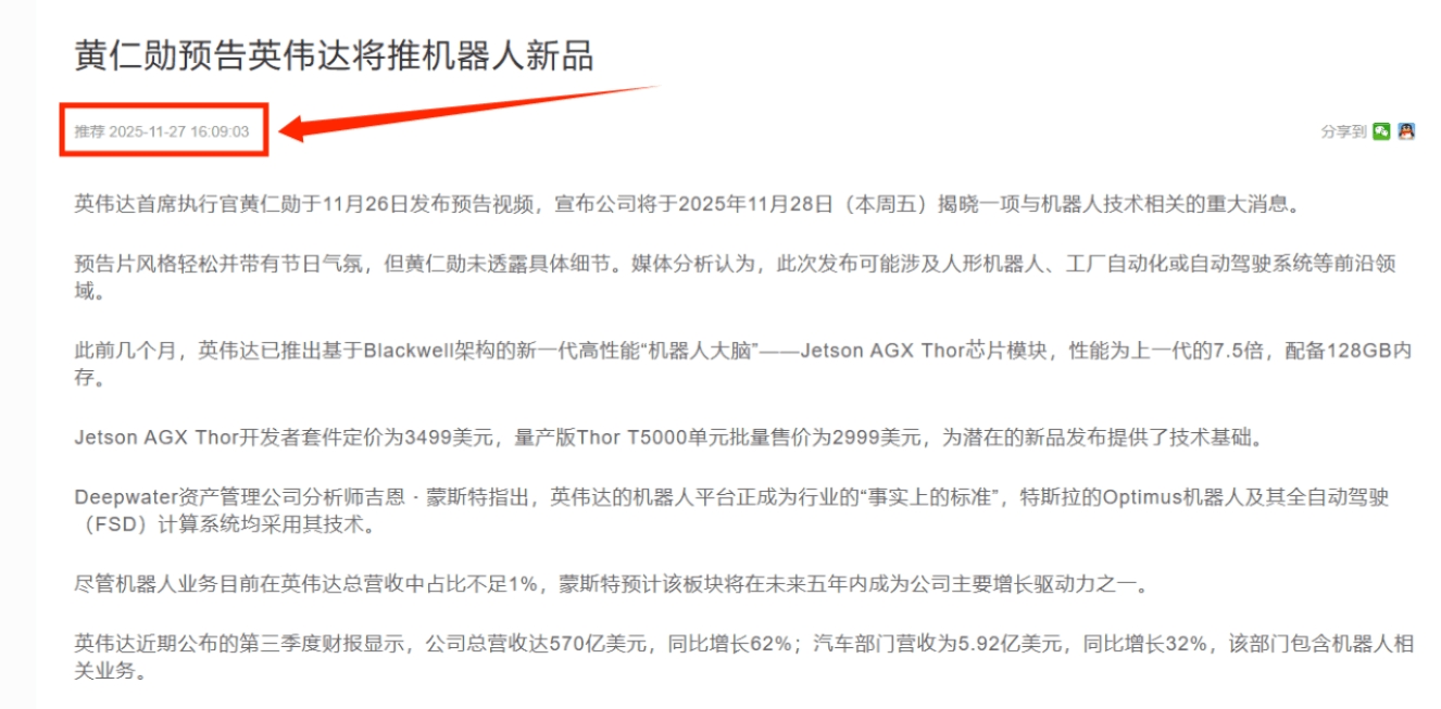 昨天下午英伟达 11月27日 16点09分 就有消息面催化,今天集合竞价出现异动 直接就是关注点。 也侧面暗示了机器人行情风云再起。