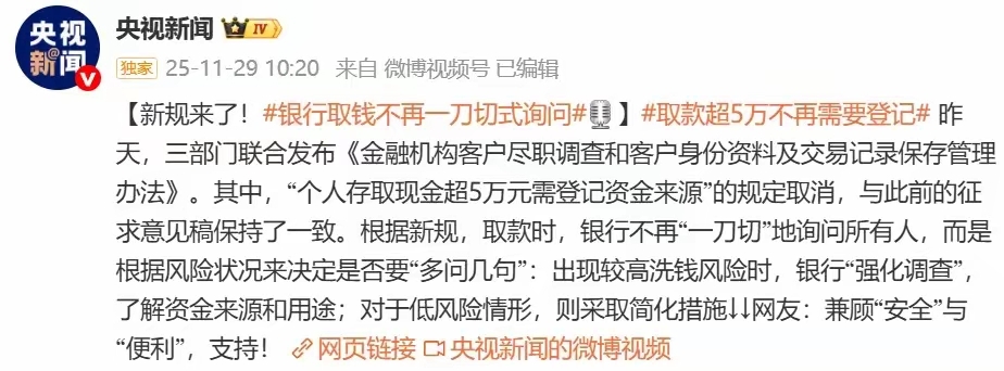 大致情况是这样的,央行、金融监管总局和证监会等三部门联合发布新规,为了降低低风险客户简化流程,为了对高风险强化调查,平衡洗钱防控与金融服务,决定取消个人存取现金超5万元登记来源。
