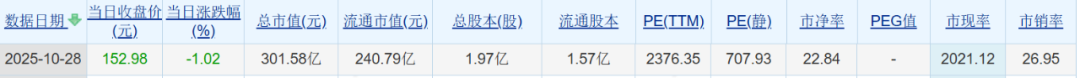 2025年10月28日,惠城环保(300779)收盘价152.98元/股,跌幅-1.02%,市盈率(TTM)2376.35倍,市净率22.84倍,市销率26.95倍,市值301.58亿元。