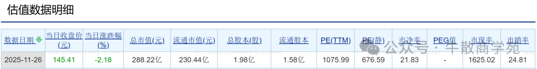 2025年11月26日,惠城环保(300779)收盘价145.41元/股,跌幅-2.18%,市盈率(TTM)1075.99倍,市净率21.83倍,市销率24.81倍,市值288.22亿元。