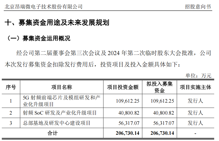 招股意向书显示,昂瑞微此次IPO募资净额,拟投向5G射频前端芯片及模组研发和产业化升级项目、射频SoC研发及产业化升级项目、总部基地及研发中心建设项目。