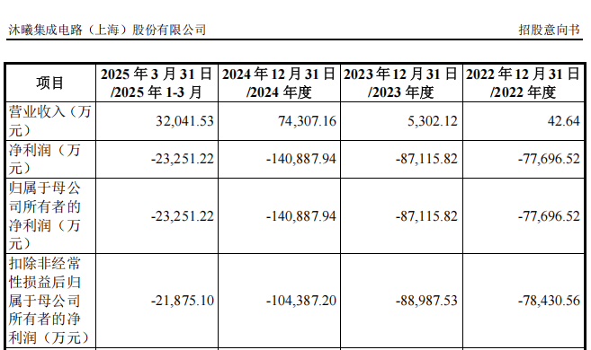 2022年至2024年及2025年第一季度,沐曦股份的营业收入分别为42.64万元、5302.12万元、7.43亿元及3.20亿元。